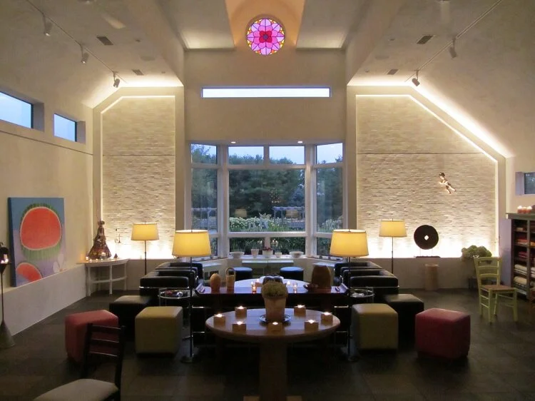 In the top photo, you can see at the peak of the ceiling, in the Mercer Room, a stained glass window designed by Tomie and executed by Jamie Morgan of Wilmot, NH.