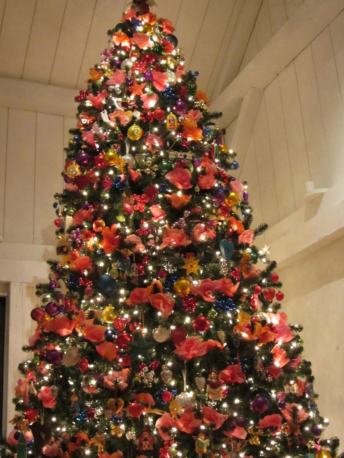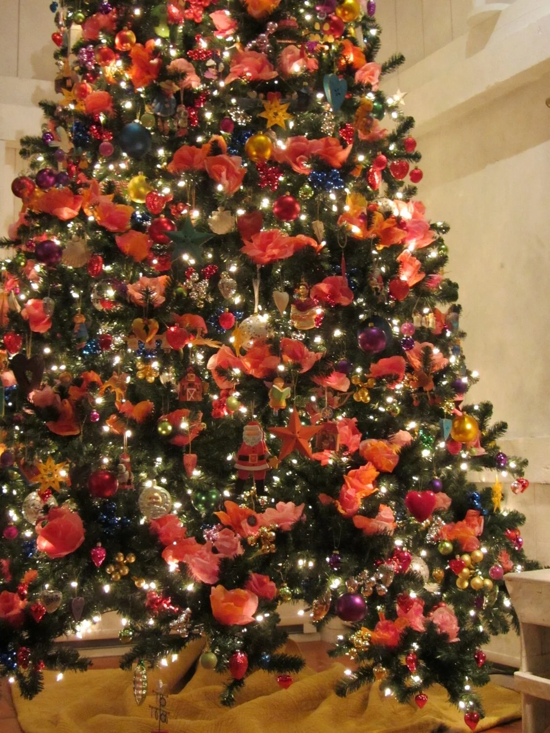Here are two images of the 2011 anteroom Christmas tree fully decorated with paper roses and some of Tomie’s “Midwest of Cannon Falls” ornaments. (Bob)