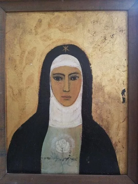 Pratt Institute friend, Delli, sent me this image from 1956. Tomie titled it “The Virgin,” but Delli said the “white breast flower sometimes refers to St. Therese.”