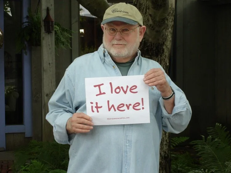 “Visit NH” had an “I love it here” promotion in 2009. Tomie was asked to participate. So, we drove around New London and elsewhere so that I could take photos of Tomie with his sign. But, his favorite #1 place was his own home. (Bob)